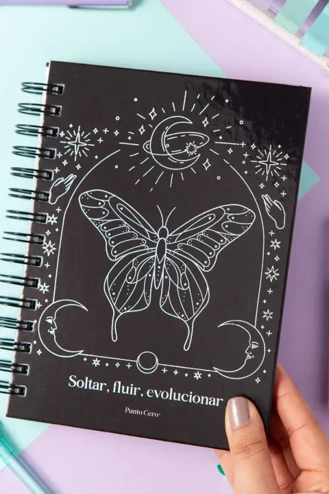 AGENDA ANILLADA TAPA DURA CON MARIPOSA PLATEADA IRIDICENTE PUNTO CERO