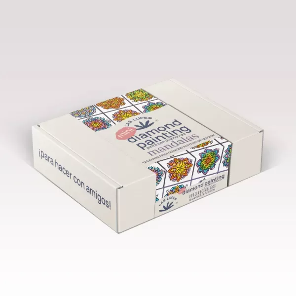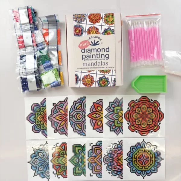 Incluye 12 mini canvas de 12x17 cm, todos con mandalas diferentes, más 12 lápices aplicadores, 12 bandejas, cera y diamantes clasificados por color.
