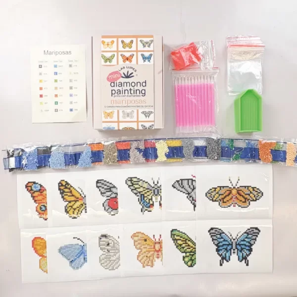 Incluye 12 mini canvas de 12x17 cm, todos con mariposas diferentes, más 12 lápices aplicadores, 12 bandejas, cera y diamantes clasificados por color.