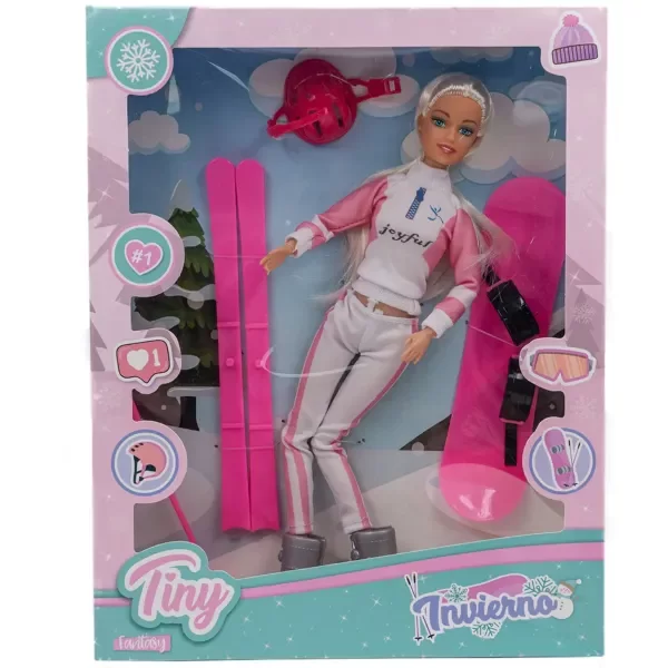 MUÑECA TINY CON ACCESORIOS DE INVIERNO INCLUYENDO SKY Y SKATEBOAR