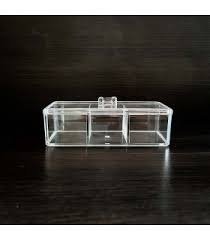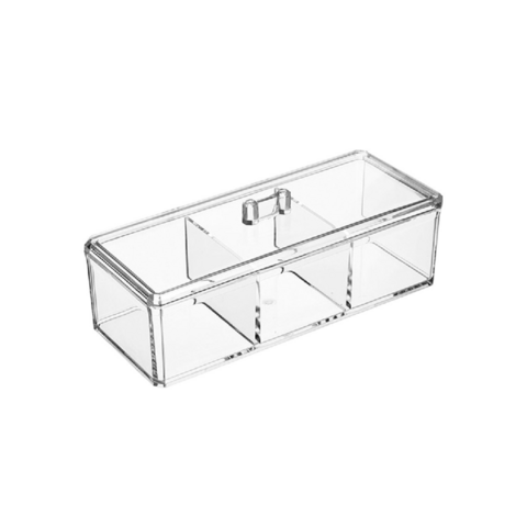 Un organizador de escritorio de acrílico transparente de 3 compartimientos con tapa.